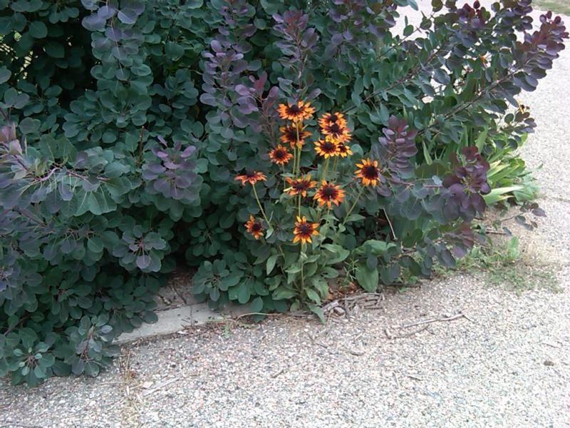 Denver Daisies out front with smoke bush