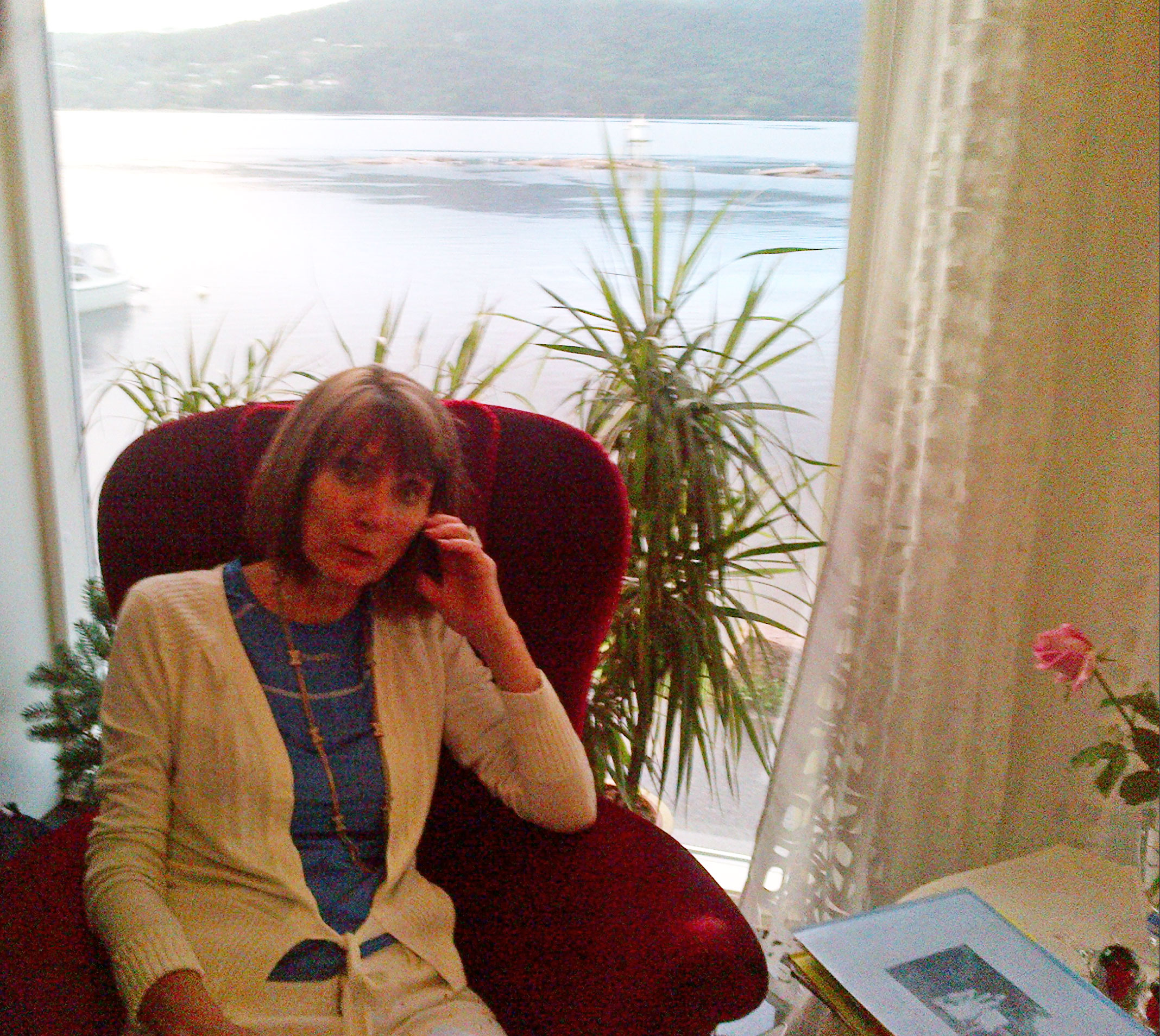 Rønnaug sitting in her front hallway with view of Drammenfjord